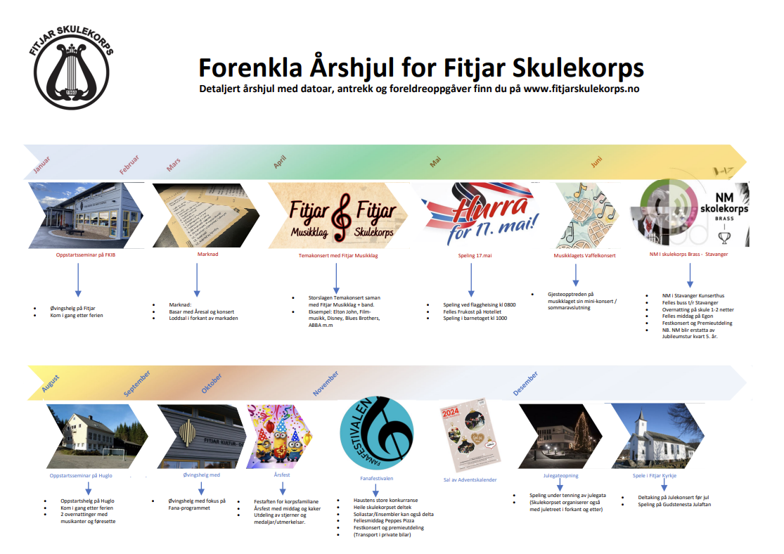 Det forenkla årshjulet er ei enkel oversikt over dei viktigaste aktivitetane korpset har gjennom året.